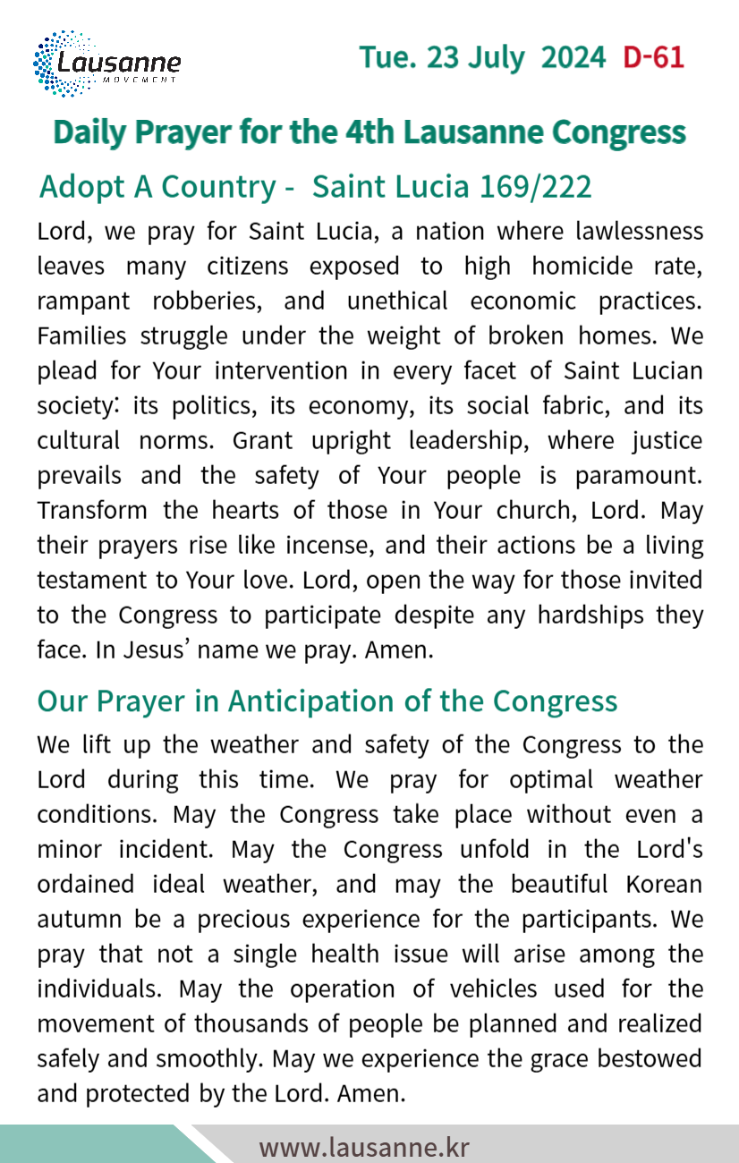 제4차 로잔대회 한국교회 매일합심기도문 7월 23일 작성자 관리자 작성일 2024-07-22 20:38 조회 388 좋아요 0 싫어요 0 인쇄 « 7월 22일 7월 24일 » 목록보기