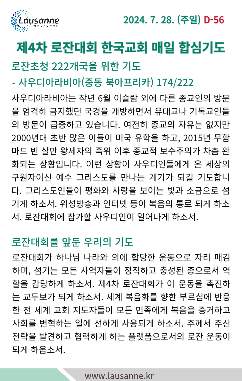 제4차 로잔대회 한국교회 매일합심기도문 7월 28일 작성자 관리자 작성일 2024-07-27 20:16 조회 323 좋아요 0 싫어요 0 인쇄 « 7월 27일 7월 29일 » 목록보기