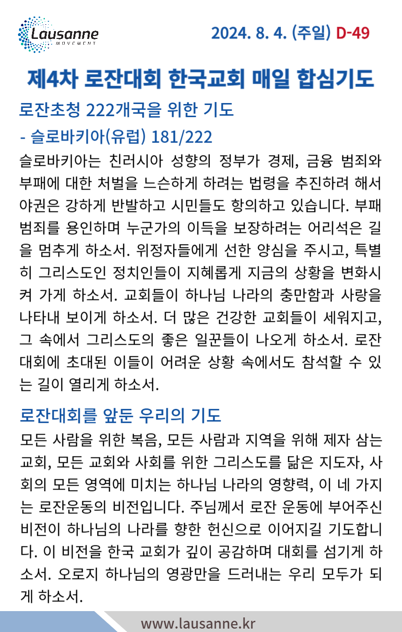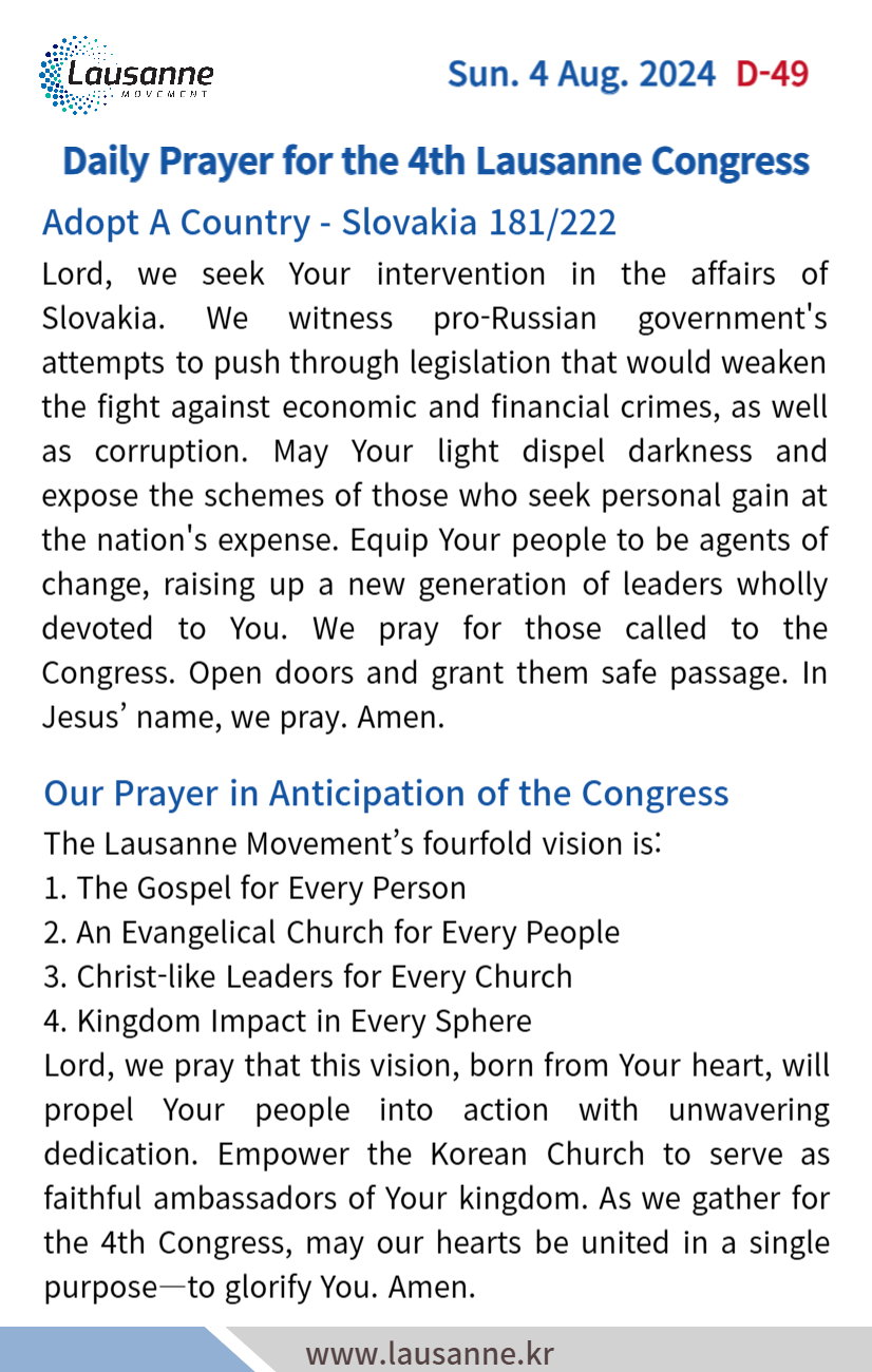 제4차 로잔대회 한국교회 매일합심기도문