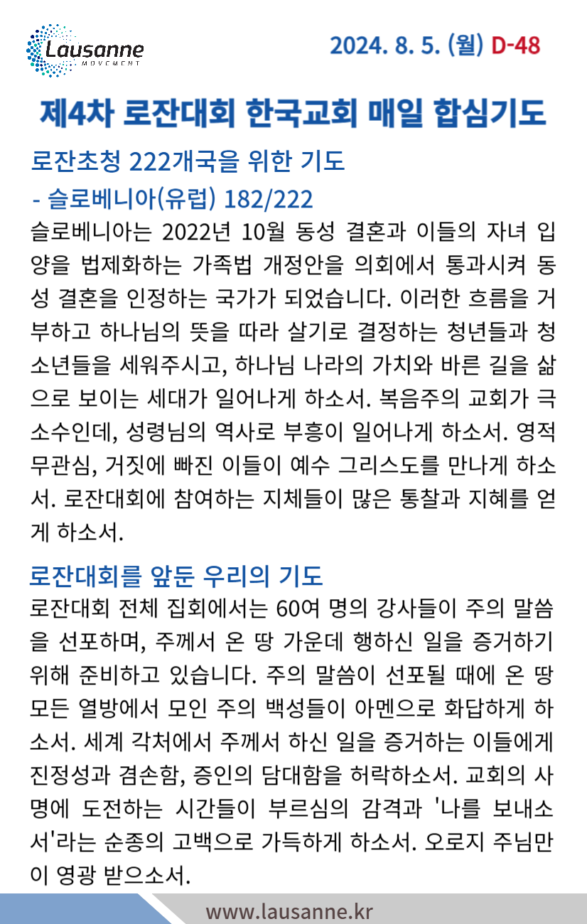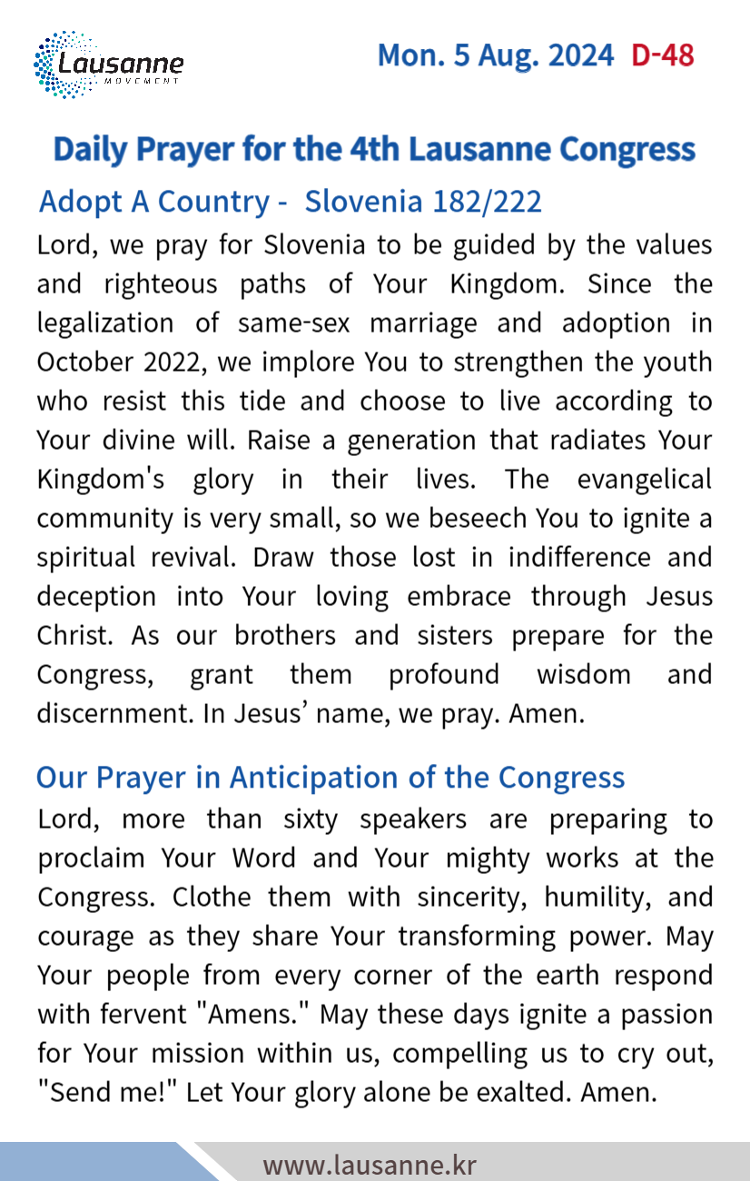 제4차 로잔대회 한국교회 매일합심기도문
