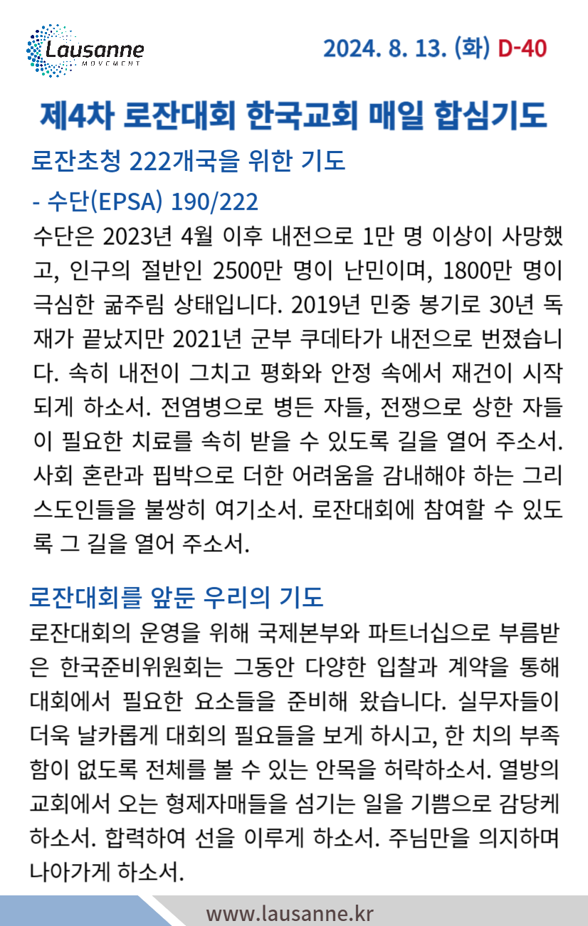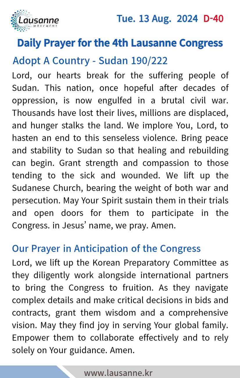 제4차 로잔대회 한국교회 매일합심기도문 8월 13일 작성자 관리자 작성일 2024-08-12 21:19 조회 359 좋아요 0 싫어요 0 인쇄 « 8월12일 8월 14일 » 목록보기