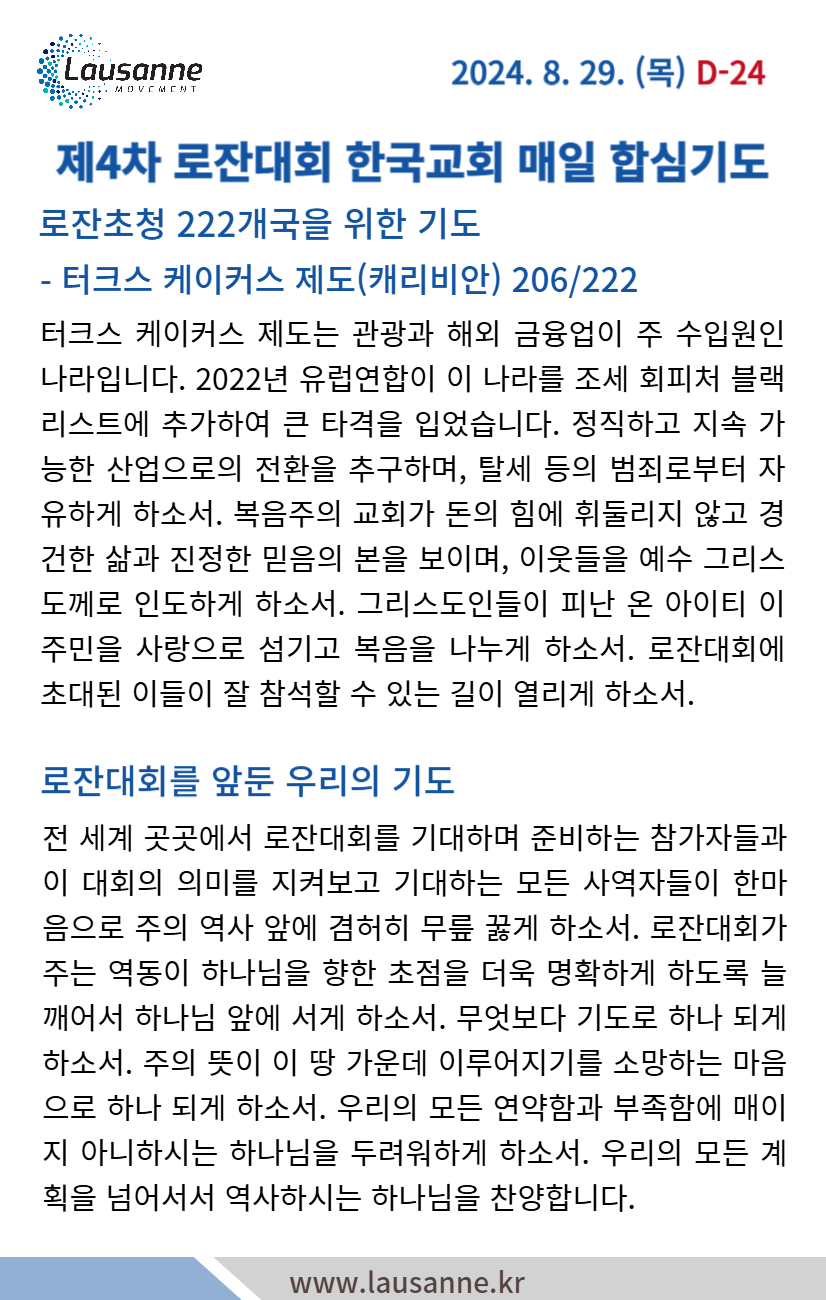 제4차 로잔대회 한국교회 매일합심기도문 8월 29일 작성자 관리자 작성일 2024-08-28 20:10 조회 351 좋아요 0 싫어요 0 인쇄 « 8월 28일 8월 30일 » 목록보기