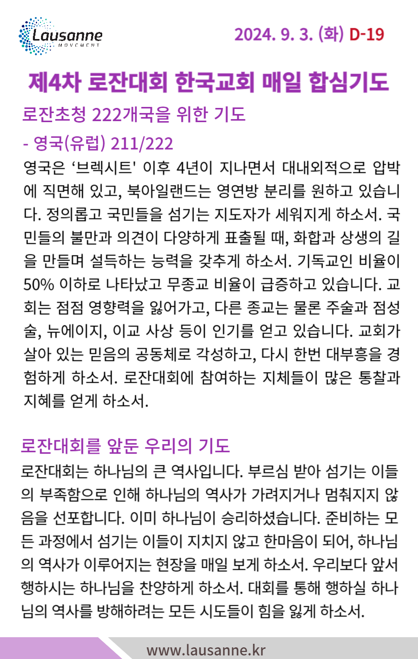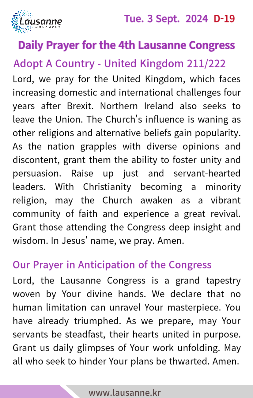 제4차 로잔대회 한국교회 매일합심기도문