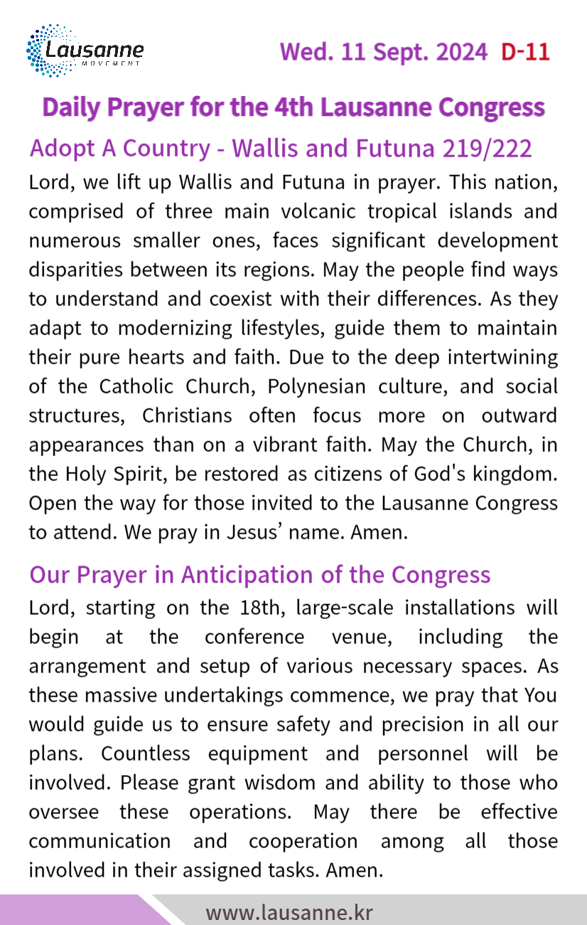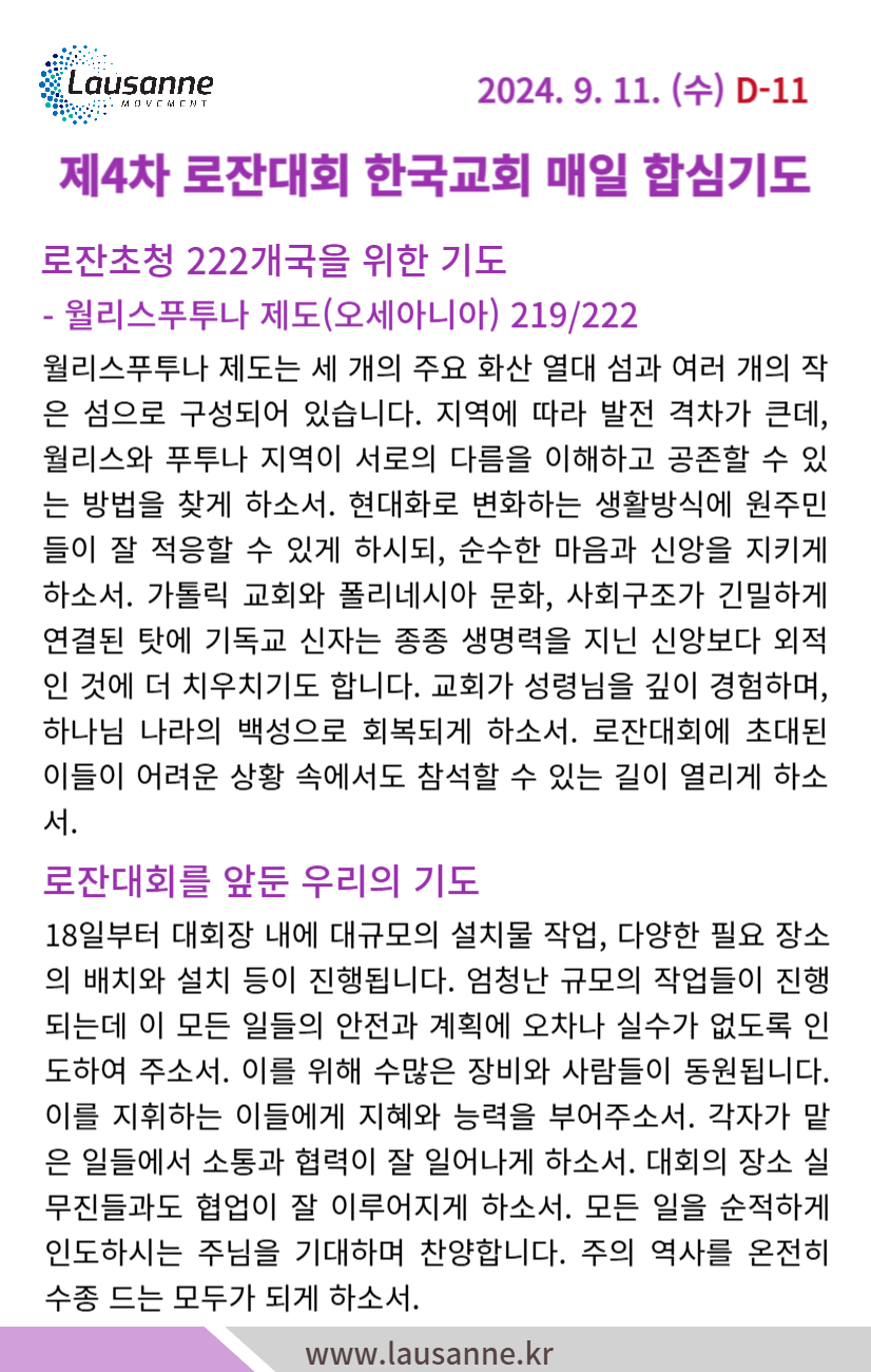 제4차 로잔대회 한국교회 매일합심기도문 9월 11일 작성자 관리자 작성일 2024-09-10 20:11 조회 376 좋아요 0 싫어요 0 인쇄 « 9월 10일 9월 12일 » 목록보기