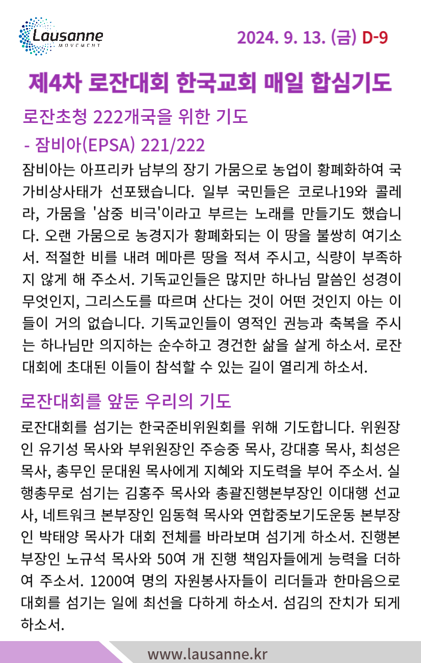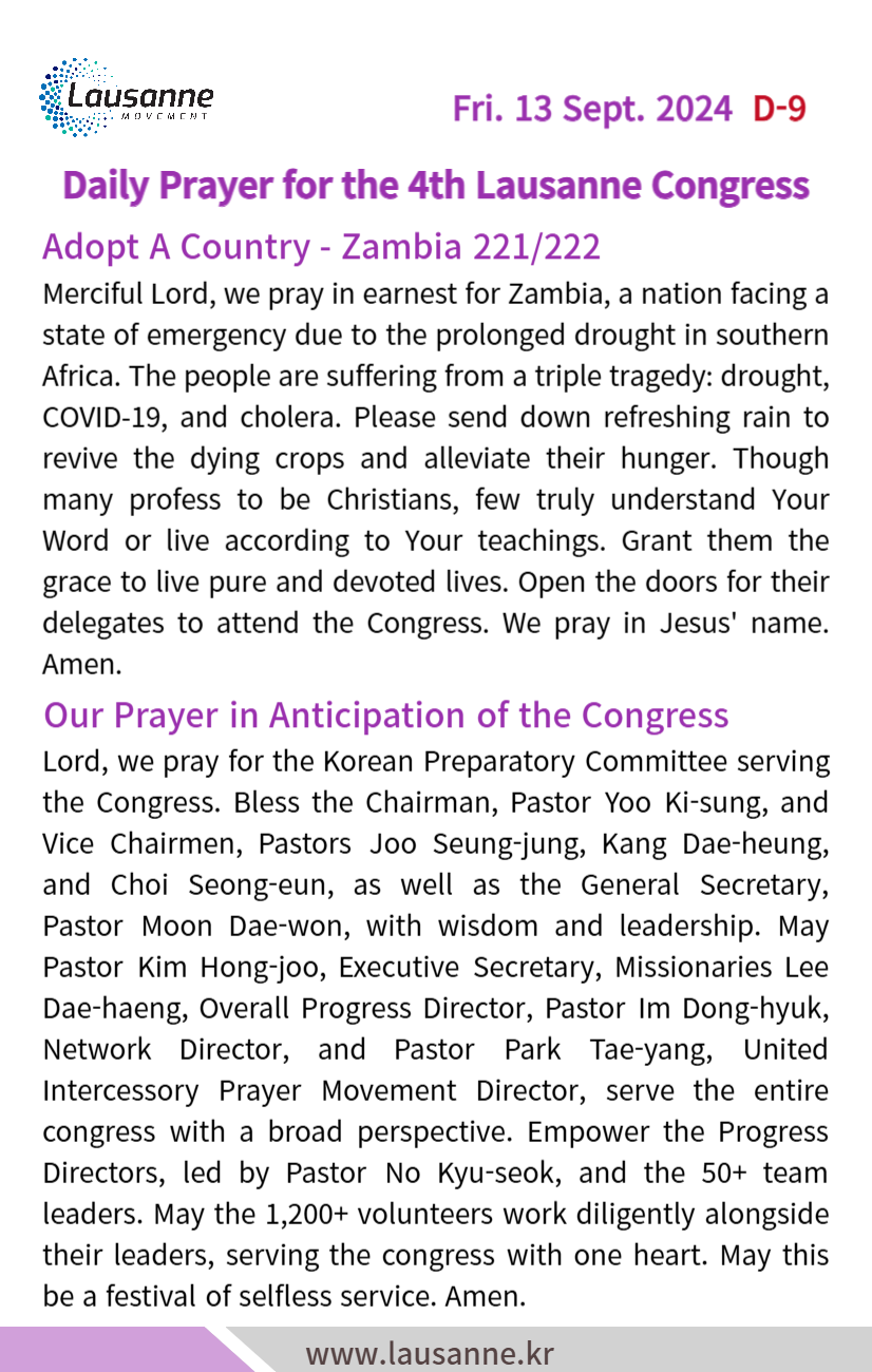 제4차 로잔대회 한국교회 매일합심기도문 9월 13일 작성자 관리자 작성일 2024-09-12 18:27 조회 313 좋아요 0 싫어요 0 인쇄 « 9월 12일 9월 14일 » 목록보기