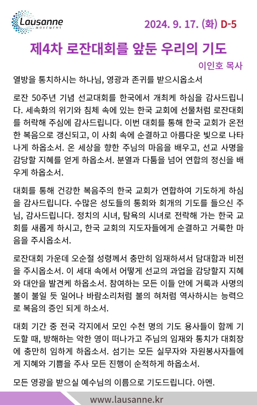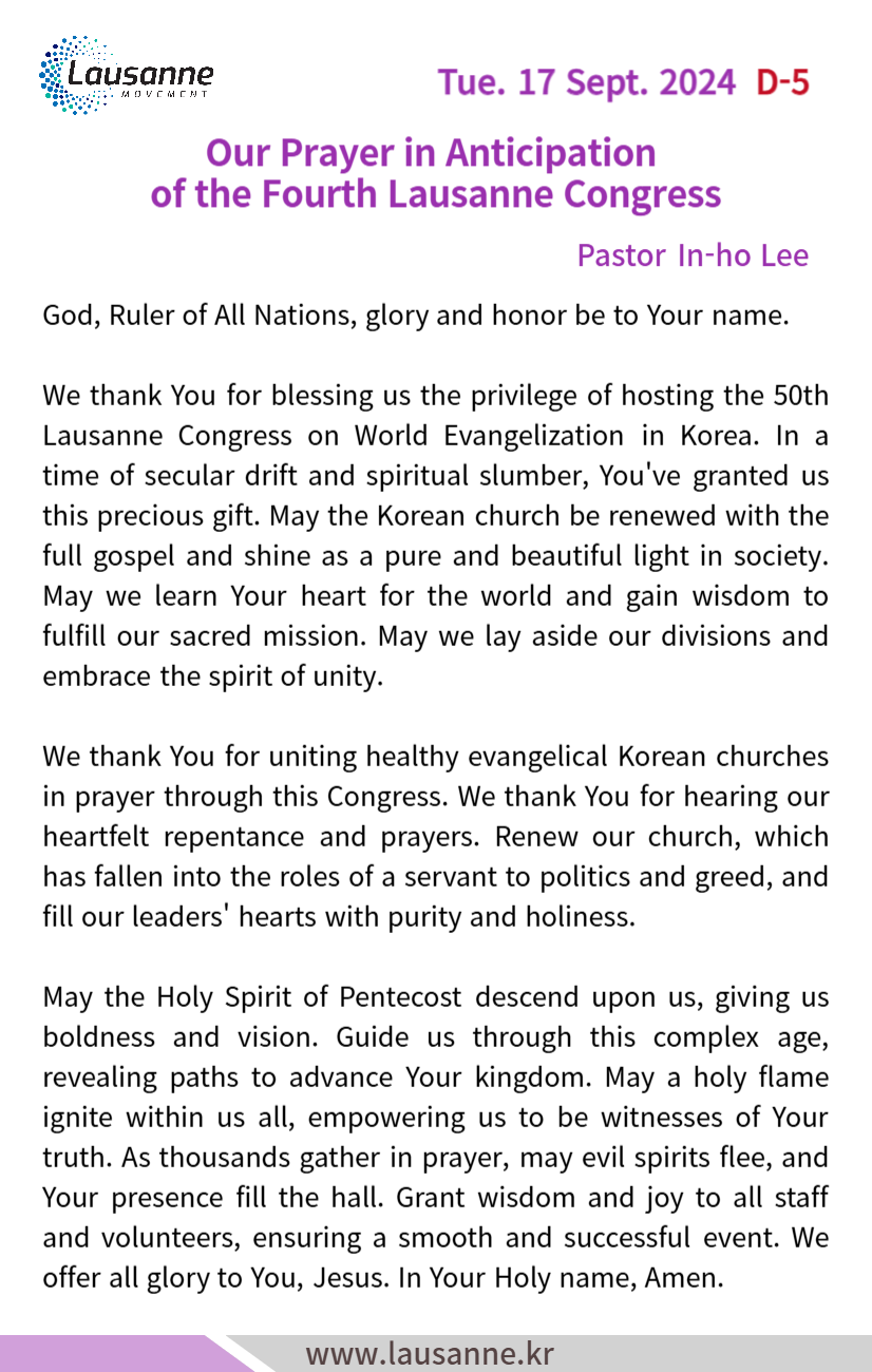 제4차 로잔대회 한국교회 매일합심기도문 9월 17일 작성자 관리자 작성일 2024-09-17 15:34 조회 281 좋아요 0 싫어요 0 인쇄 « 9월 16일 9월 18일 » 목록보기