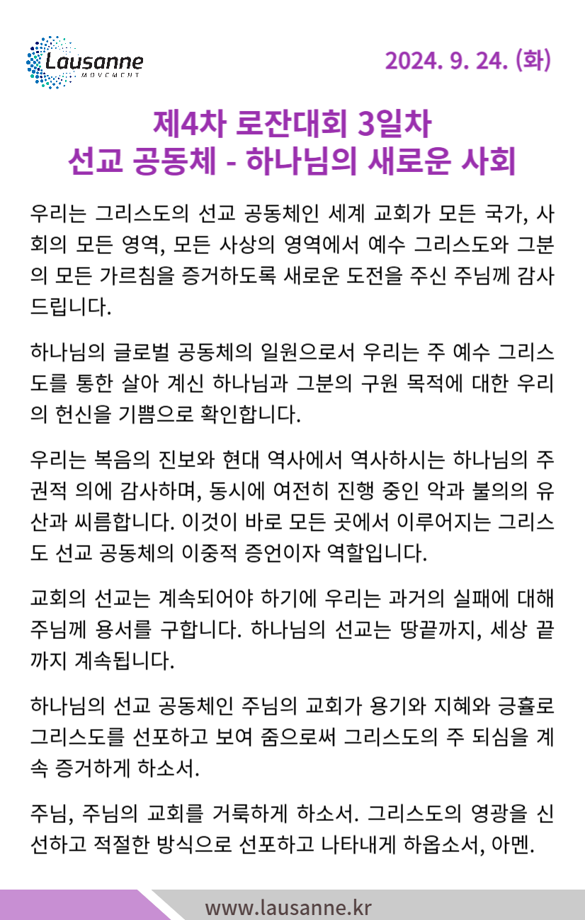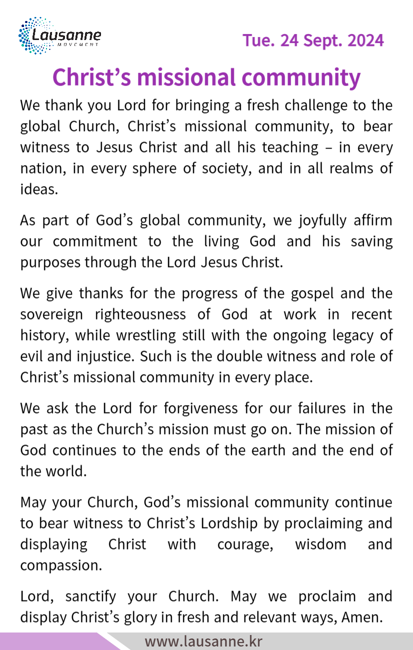 제4차 로잔대회 한국교회 매일합심기도문 9월 24일 작성자 관리자 작성일 2024-09-23 22:53 조회 720 좋아요 0 싫어요 0 인쇄 « 9월 23일 9월 25일 » 목록보기