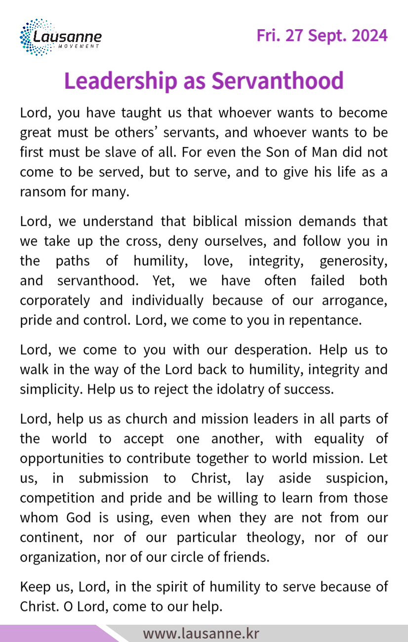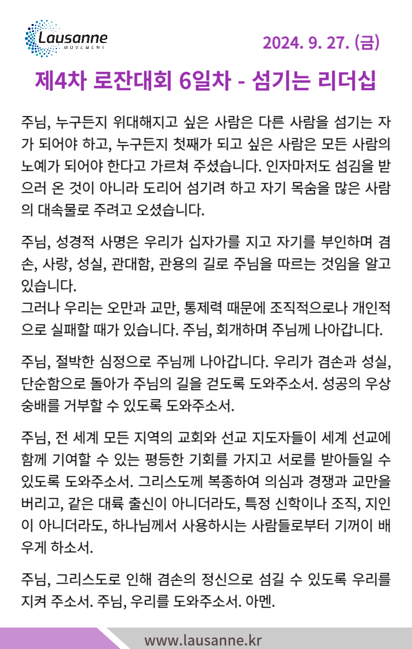 제4차 로잔대회 한국교회 매일합심기도문 9월 27일 작성자 관리자 작성일 2024-09-26 21:07 조회 606 좋아요 0 싫어요 0 인쇄 « 9월 26일 9월 28일 » 목록보기