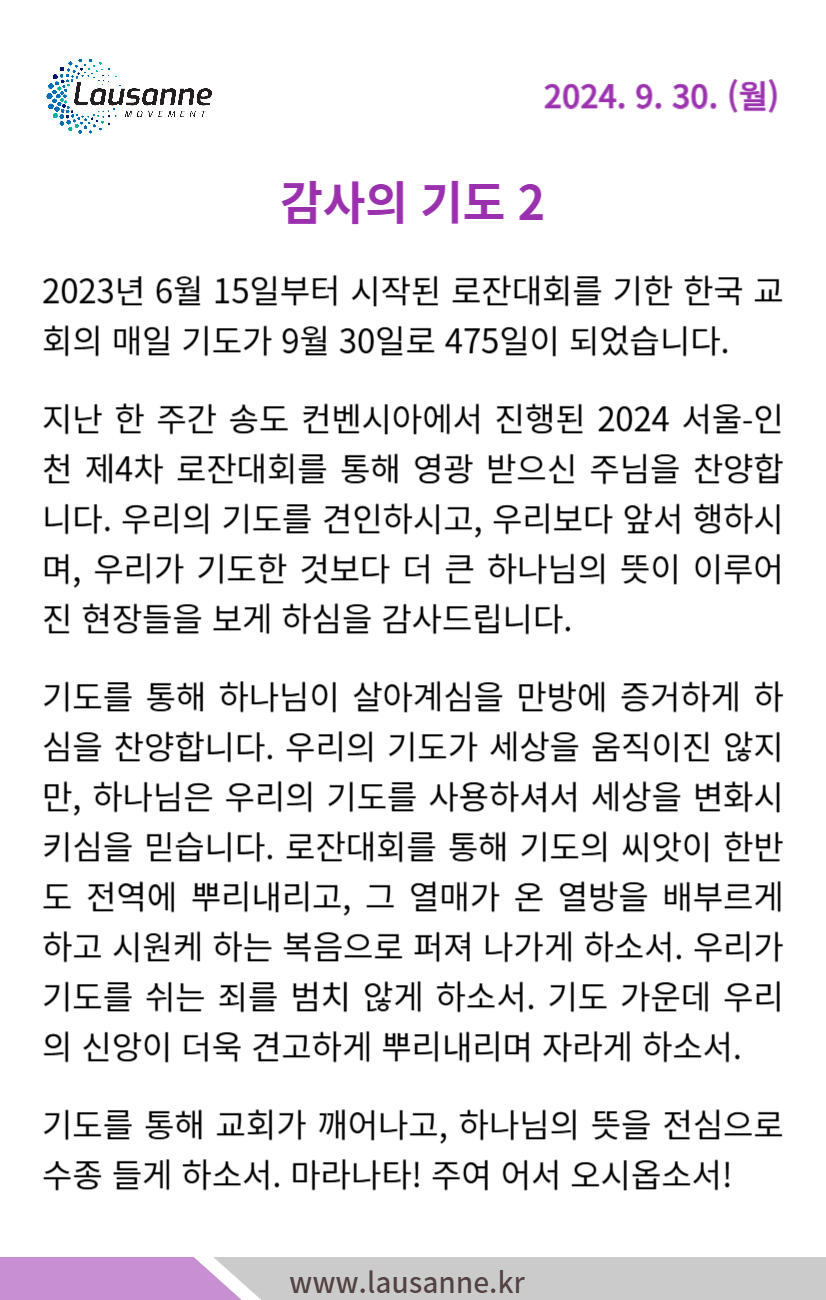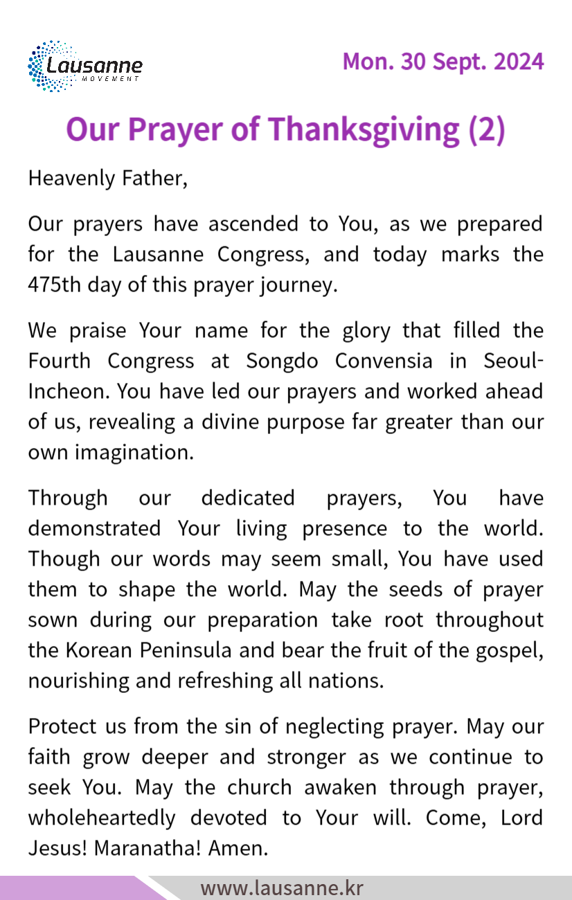 제4차 로잔대회 한국교회 매일합심기도문