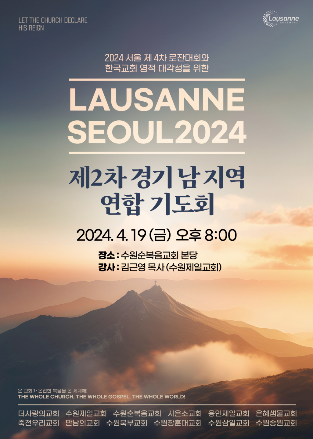 2024년 9월 인천 송도에서 진행되는 제4차 로잔대회를 한국교회가 기도로 섬기는 연합 운동에 전국 각 지역의 교회들이 함께 하고 있습니다.