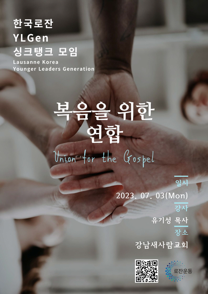 한국로잔 YLGen(대표: 오장석 목사)이 2023년 7월 3일(월) 오전 10시 ~ 오후 9시까지 강남새사람교회에서 ‘복음을 위한 연합’이라는 주제로 싱크탱크 모임을 가졌다. 이번 모임은 2024년 제4차 로잔대회를 준비하며 한국교회의 청년 리더들을 초청하여 로잔 정신을 바탕으로 우정을 나누고, 관심 분야별 소그룹 모임을 통해 네트워크를 형성하여 연합을 통한 복음 전파를 독려하는 데 초점을 두었다. 유기성 목사(제4차 로잔대회 한국준비위원회 위원장)를 주 강사로 모시고 YLGen 리더들이 세미나와 소그룹 모임을 이끈 이날 모임에는 로잔운동에 관심 있는 청년 약 40명이 참석하였다. 이 싱크탱크 모임을 통해 앞으로 기독 청년들이 복음을 위해 더욱 활발한 교류와 협력이 일어나길 기대한다.