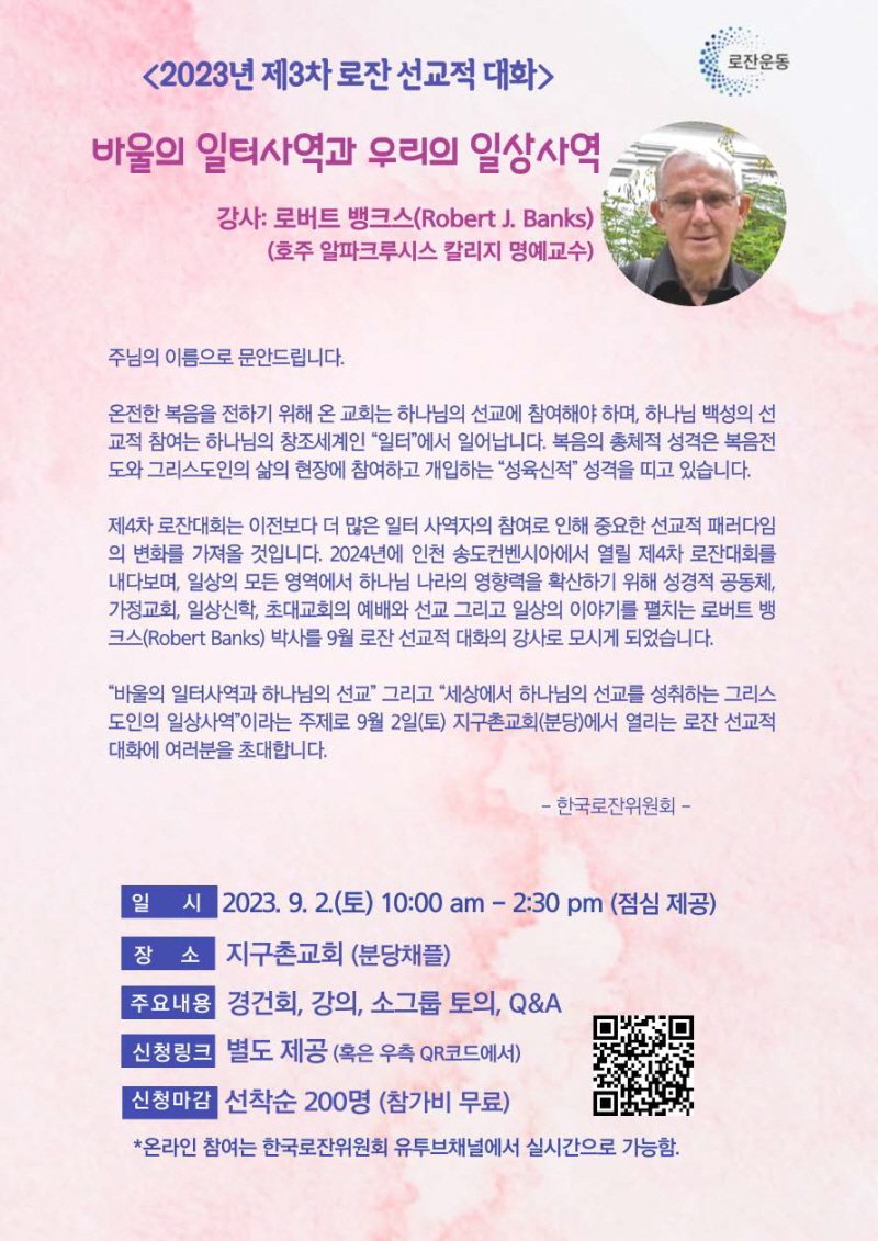 한국로잔위원회에서 격월로 개최하는 ‘선교적대화’가 코로나 팬데믹 이후 첫 대면 모임으로 만났다. 전 풀러 신학교 평신도 사역 및 신학 담당 교수를 역임하신 호주 신학자 로버트 뱅크스박사를 강사로 초청하여, 2023년 9월 2일(토) 오전 10시부터 오후 2시 40분까지 지구촌교회 분당 채플에서 열린 이 자리에, 초대 교회와 일터 사역에 관심이 있는 많은 평신도 전문인, 선교사, 목회자, 성도 등 현장과 온라인으로 150여 명이 모였다. 프로그램은 경건회(설교: 최성은 목사)를 시작으로, ‘바울의 일터 사역과 우리의 일상 사역’이라는 주제로 두 차례의 강의, 점심 식사 및 소그룹 토의, Q&A, 그리고 합심 기도로 구성되었다. 통역은 IFES 이시아 부총무로 섬기는 김종호 목사가 맡았다.