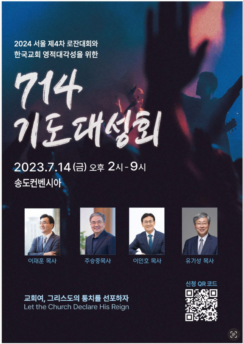 2024 제4차 로잔대회를 일 년여 앞둔 2023년 7월 14일(금)에, 로잔대회 개최 장소인 송도컨벤시아에서 제4차 로잔대회의 준비와 한국 교회 영적 대각성 위한 연합 기도의 자리인 ‘714기도대성회’가 열렸다. 이날 프로그램은 이재훈 목사, 주승중 목사, 이인호 목사, 유기성 목사의 말씀 선포, 그리고 찬양 및 기도 선포 등 제3부에 걸쳐 진행되었으며, 폭우 속에서도 전국 450여 개 교회에서 모인 1만여 명의 성도가 한국 교회와 세계 선교 그리고 제4차 로잔대회를 위해 하루 종일 기도하며 하나님의 임재를 구했다.