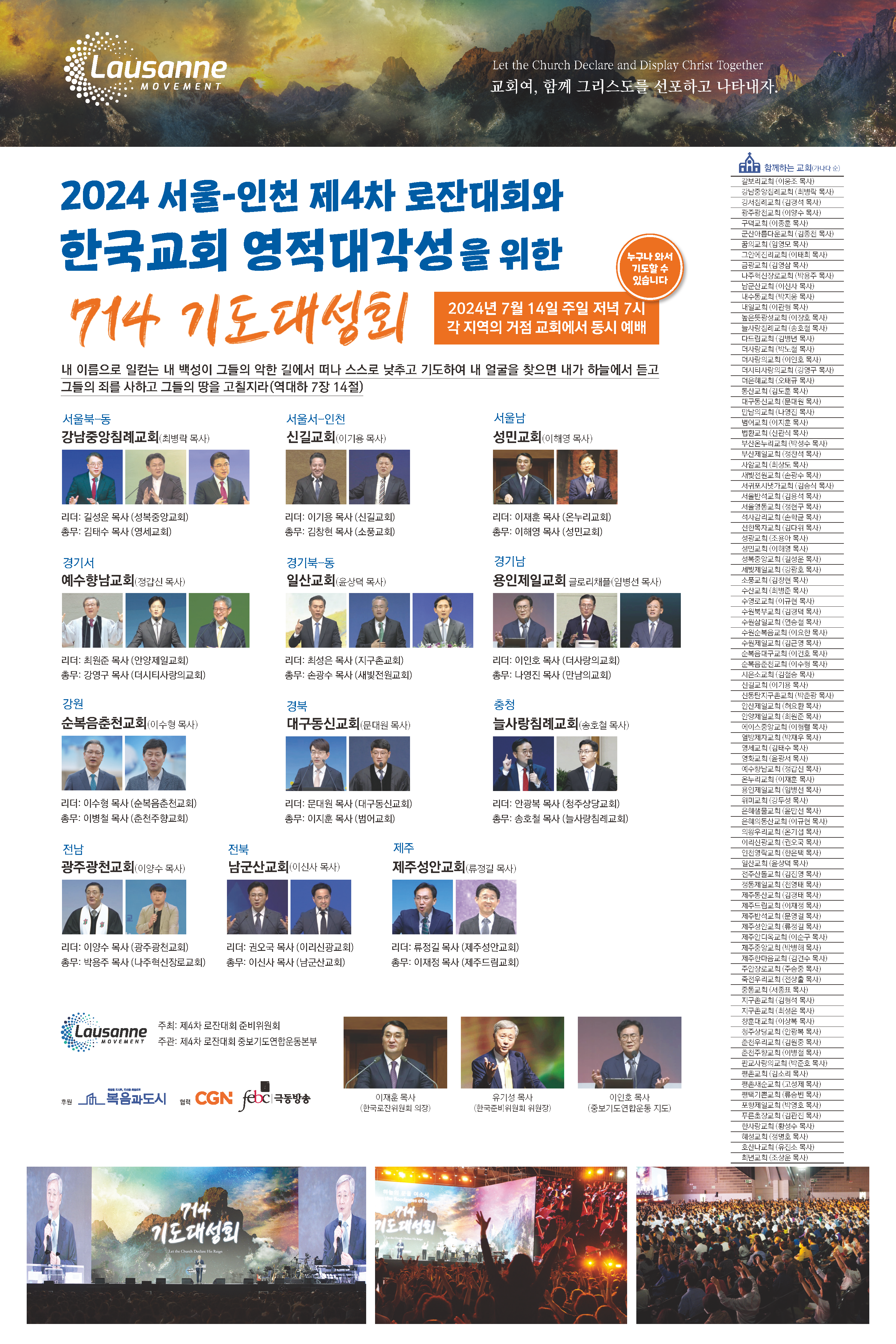2024 서울-인천 제4차 로잔대회와 한국교회의 갱신과 부흥을 위해 기도할 714 기도대성회에 여러분을 초대합니다. 올해는 전국의 각 권역별 거점교회에서 동시에 기도모임을 진행할 예정입니다. 함께 겸손히 연합하여 기도할 때 하나님께서 우리의 기도를 들으시고 이 땅을 고치시고 제4차 로잔대회를 통해 영광 받으실 줄 믿습니다. 함께 기도해 주시기 바랍니다.