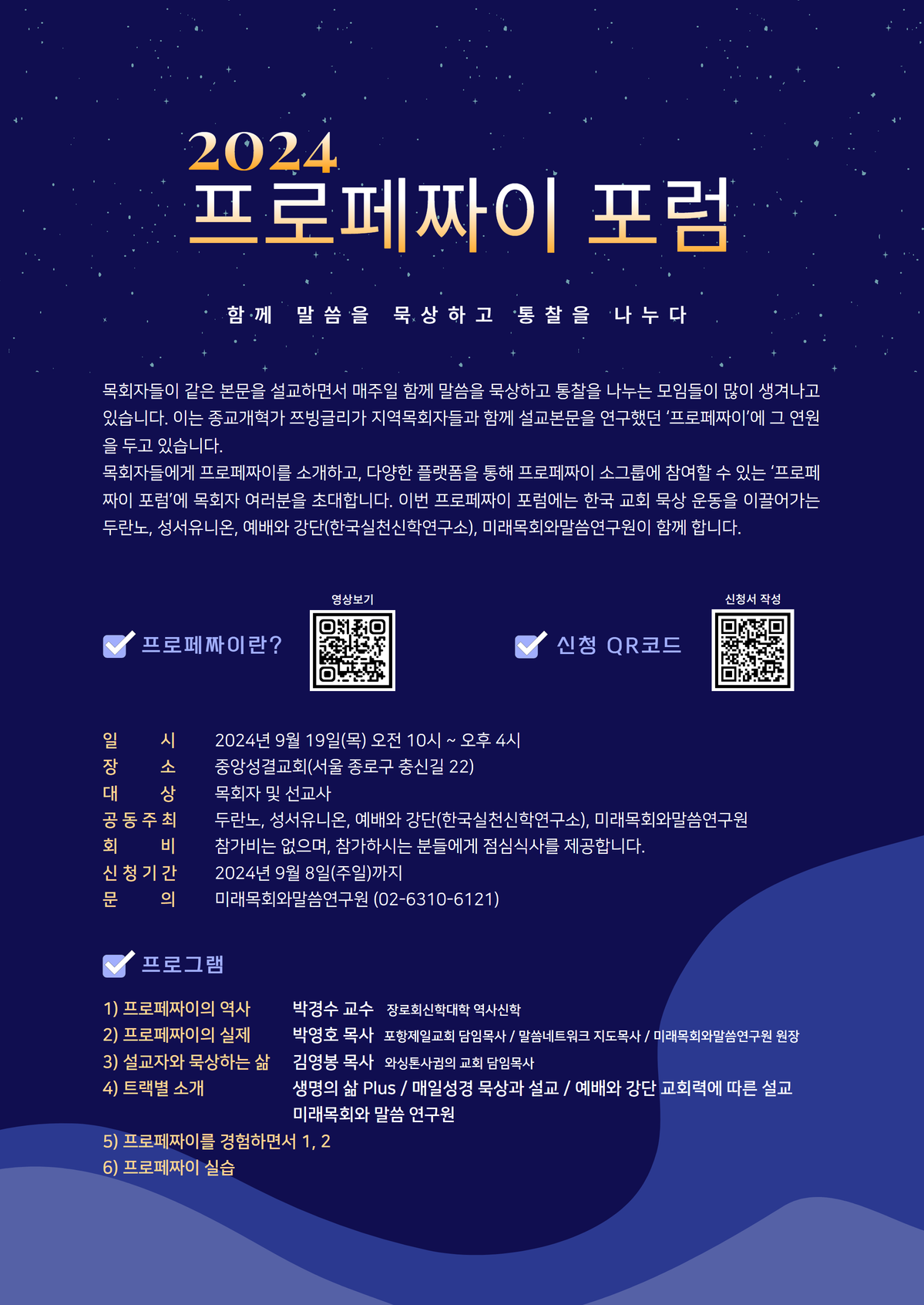 목회자들에게 프로페짜이를 소개하고, 다양한 플랫폼을 통해 프로페짜이 소그룹에 참여할 수 있는 ‘프로페 짜이 포럼’에 목회자 여러분을 초대합니다.